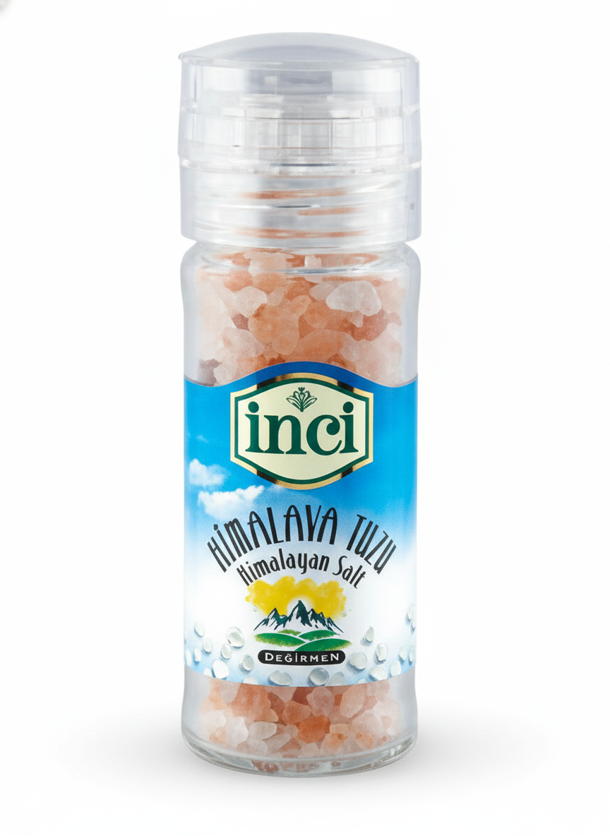 İnci Baharat Himalaya Tuzu, Pakistan Himalaya eteklerinden çıkarılan mineral zengini pembe kristal tuzların özenle seçilip cam değirmenli ambalajda sunulmuş halidir.