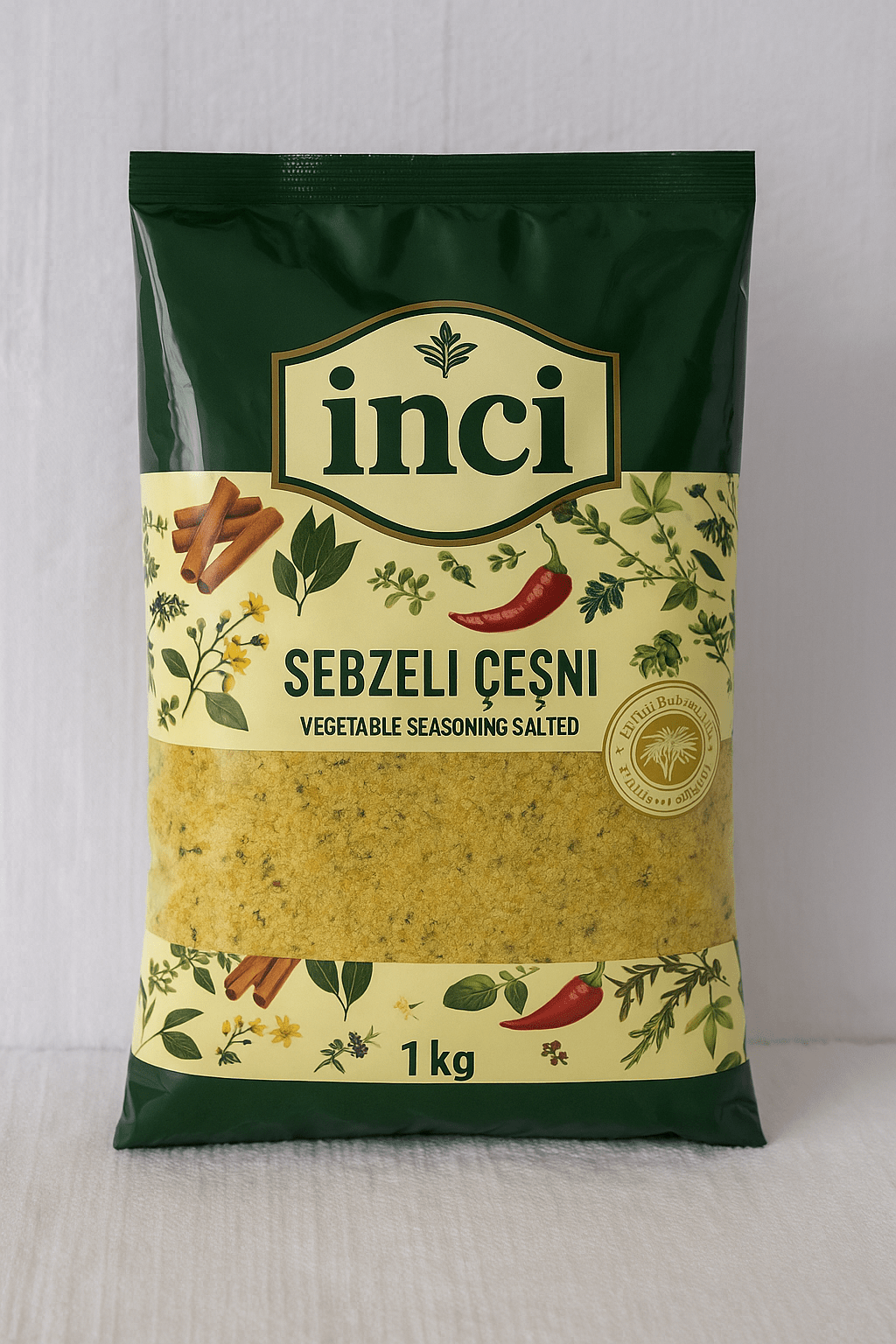 Sebzeli Çeşni Tuzlu, İnci Baharat’ın aromatik sebzelerle desteklediği özel bir tatlandırıcıdır. İçeriğinde havuç, pırasa, soğan, sarımsak gibi sebze tozları; tuzla dengelenmiş şekilde sunulur. Hazır çorbalardan fırın yemeklerine, sebze sotelerden pilavlara kadar çok geniş bir kullanım alanına sahiptir. 1kg’lık ambalajı özellikle büyük mutfaklar için idealdir.
